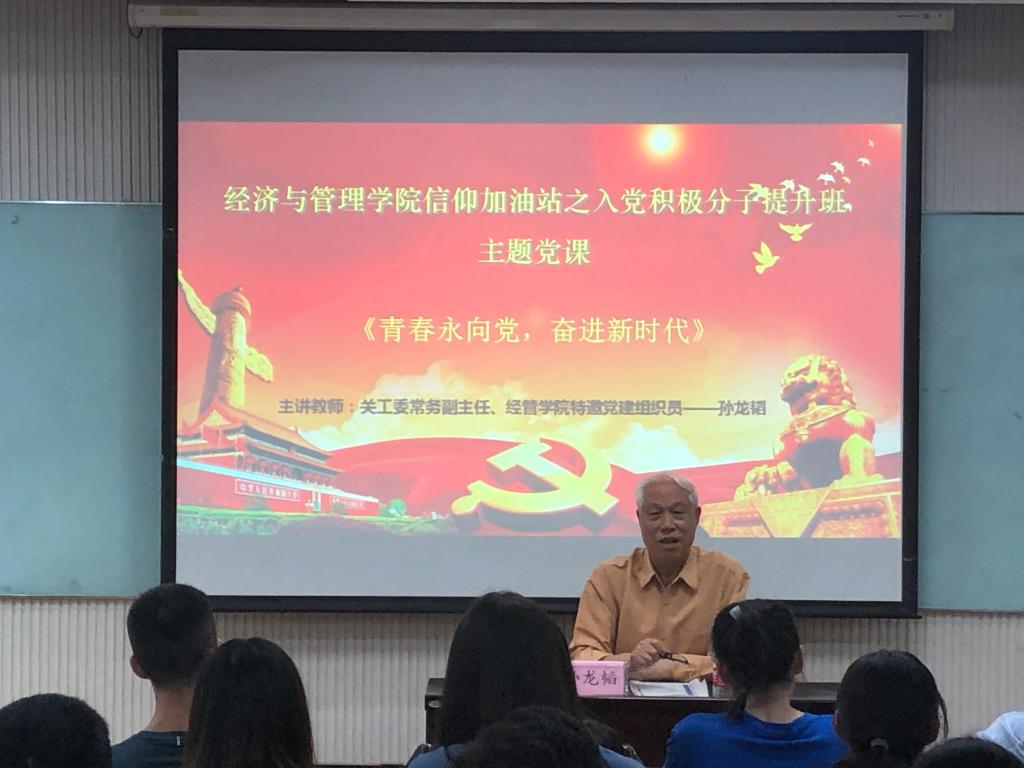 6月20日16:00,英国365集团公司信仰加油站系列活动之“青春永向党,奋斗新时代”主题党课于教十一楼319成功举办。本次党课主要面向经管院第55期入党积极分子提升班全体学员,同时荣幸邀请到英国365集团公司关工委常务副主任、英国365集团公司特邀党建组织员孙龙韬老师担任主讲人。