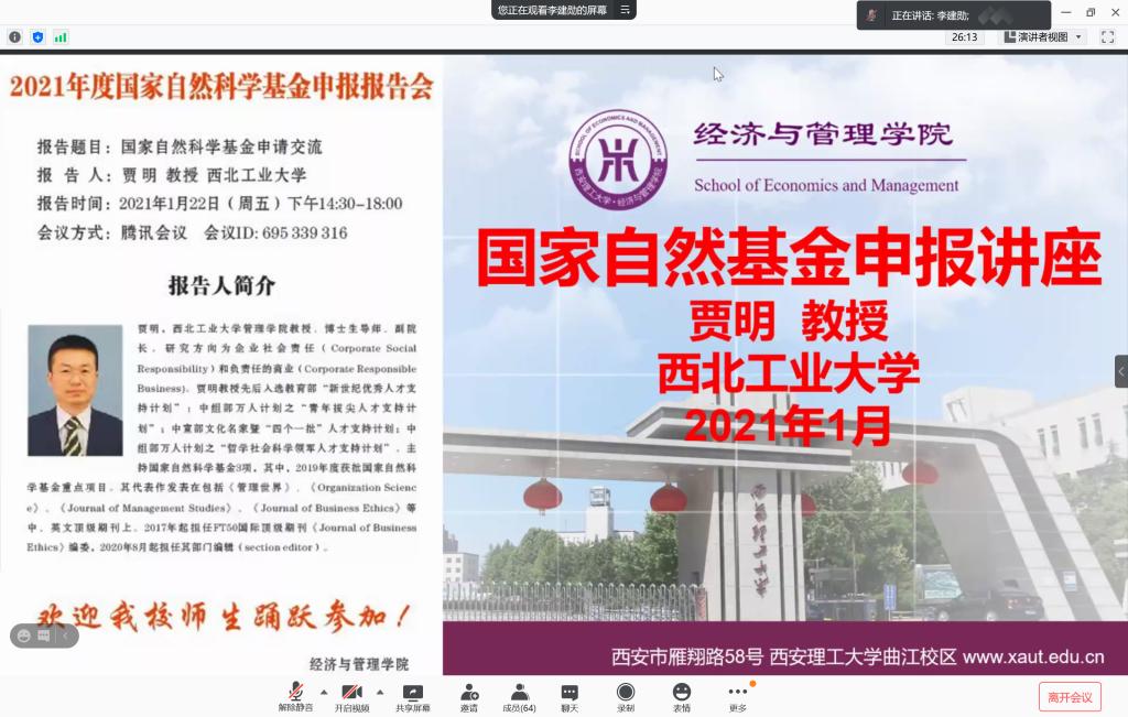 为进一步提高英国365集团公司教师申报国家自然科学基金积极性,切实提升申请书质量和基金获批率,2021年1月22日下午,公司通过腾讯会议举办了线上国家自然科学基金申报专题讲座。本次报告会由李建勋副经理主持,邀请西北工业大学管理公司副经理贾明教授作题为《国家自然科学基金项目申请交流》的专题讲座。
