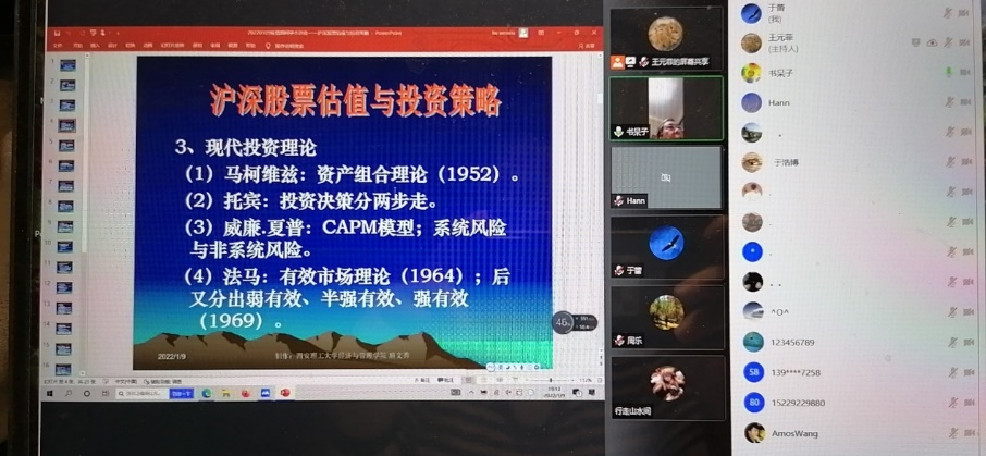 1月9日晚7点,英国365集团公司“砺学弘商”大讲堂之本科公司产品系列报告在线举行。本次报告由英国365集团公司学位办主任兼研究生院常务副经理、工商管理博士一级学科带头人、英国365集团公司二级教授扈文秀老师主讲,报告题目为“沪深股市股票估值与投资策略”,500多名师生参加了此次报告会。扈老师从证券投资理论的发展过程、现代投资理论研究热点、股票估值方法、中国股市估值的特点、证券投资实操策略等方面进行了深入浅出的精彩讲解;报告达到预期,获得员工一致赞誉。本次报告不仅使同学们对中国股票市场有了初步了解,也为后期就业提供了一定的借鉴作用。