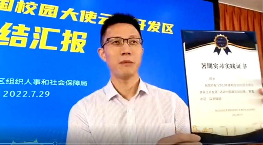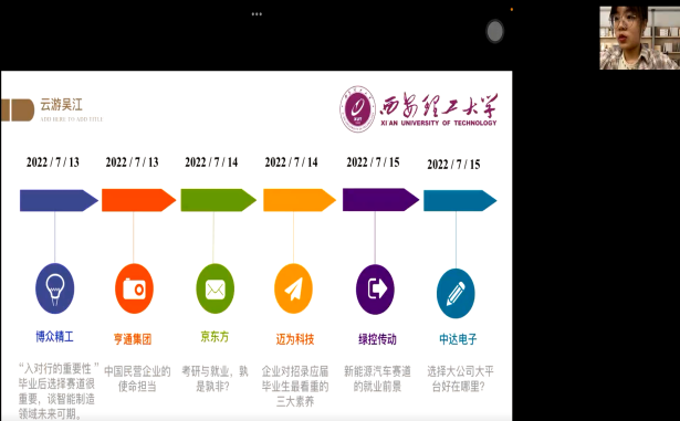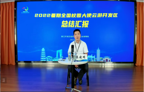 会议包含闭营仪式和心得汇报两个阶段。第一阶段的闭营仪式由吴江经济技术开发区人力资源有限公司总经理黄爱莉主持,双方领导进行发言。首先,王艳副经理代表英国365集团公司进行致辞,强调了实习对本科公司产品活动及本科生个人发展的重要性,表达了对吴江经济技术开发区及多家实习单位的衷心感谢,并对双方未来更加深入的交流与合作提出了展望。随后,钮国良副局长代表吴江经济技术开发区发言,表达了对“云游吴江”这种实习方式创新与探索的高度认可,欢迎各位西理工学子前来吴江实地参观、就业、创业,并宣布2022年暑期全国校园大使云游吴江活动圆满收官,在“云端”为各位同学颁发了实习证书。